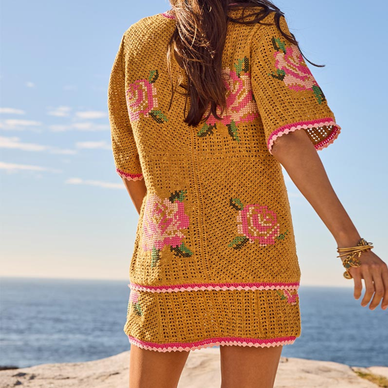 The Coastal Granny Mini Skirt in vibrant Mustard brings playful retro charm to your wardrobe. Crafted from a breathable blend of linen and organic cotton, it features delicate embroidered flowers that add a whimsical touch. Perfectly mini in length, this true knit piece pairs beautifully with the Coastal Granny Maxi Cardigan and Top for a full vintage-inspired outfit or stands out on its own with simple neutrals for easy, eye-catching style.