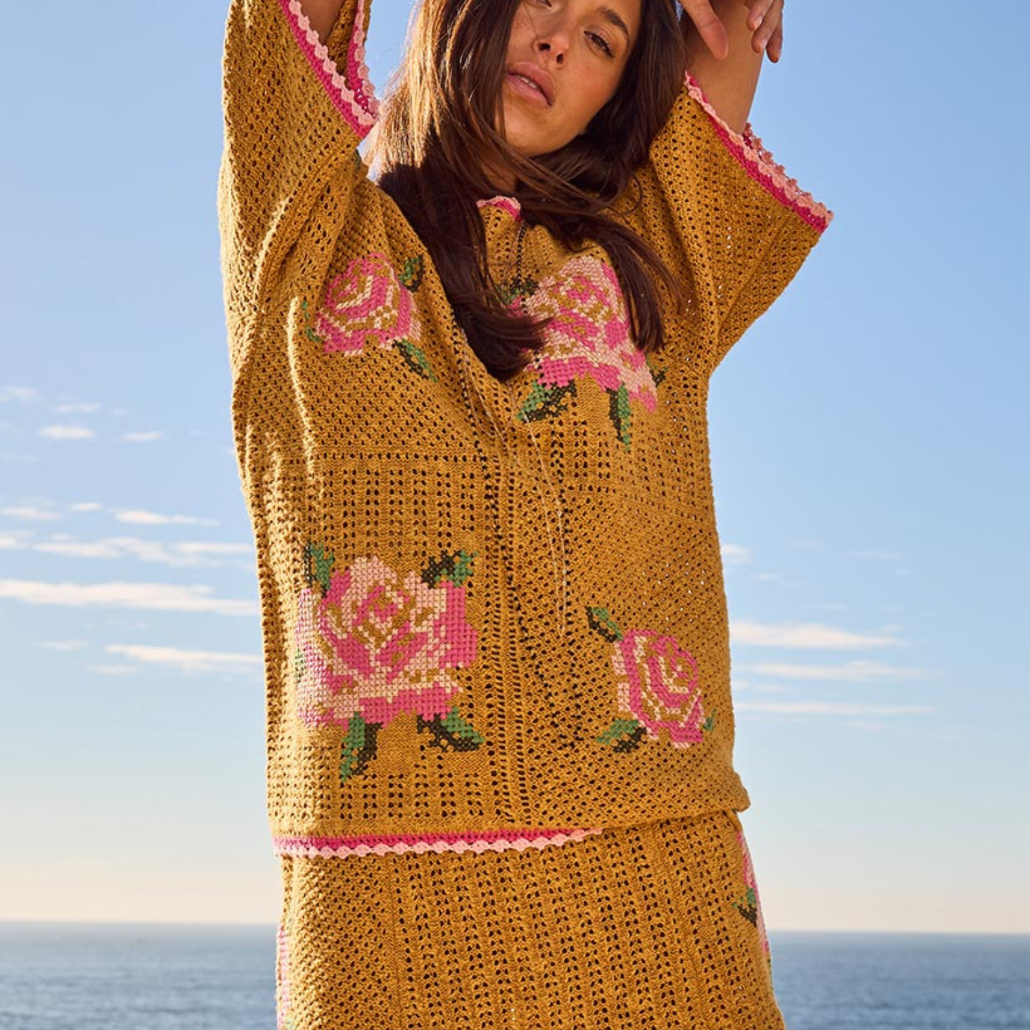 The Coastal Granny Top in mustard brings a playful nod to vintage charm with its true knit fabric and delicate embroidered flower design. Crafted from a breathable blend of linen and organic cotton, it’s perfect for layering or standing out solo. Pair it with the Coastal Granny Maxi Cardigan and Mini Skirt for a retro-inspired outfit, or mix it with your favourite neutrals for an effortless, sunny style boost.