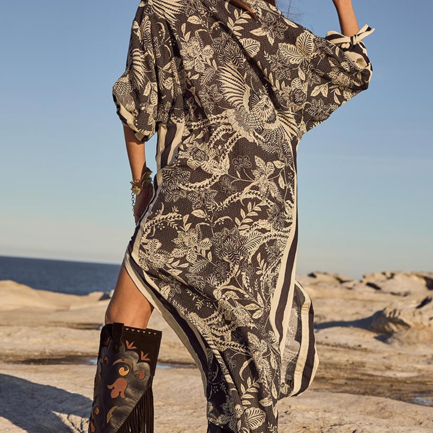 The Volcano Goddess Kaftan in Liquorice radiates effortless cool with a playful spirit. Made from 100% organic cotton crinkle, its custom Spell allover print adds a splash of fun, while the dropped shoulders and wide sleeves with delicate hem ties create a breezy, flattering silhouette. Finished with a bold side stripe detail, this kaftan is your go-to for relaxed days filled with style and adventure.