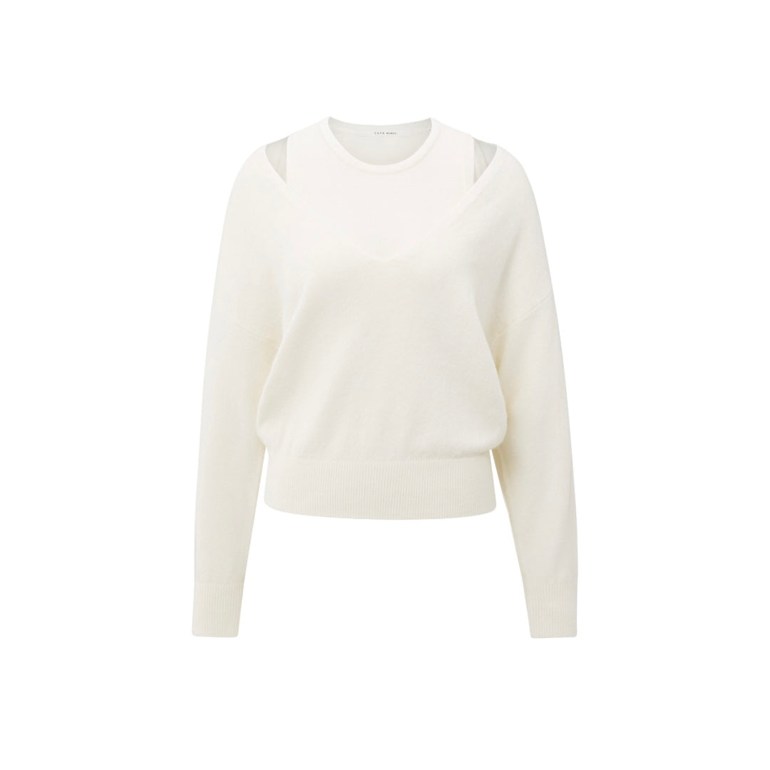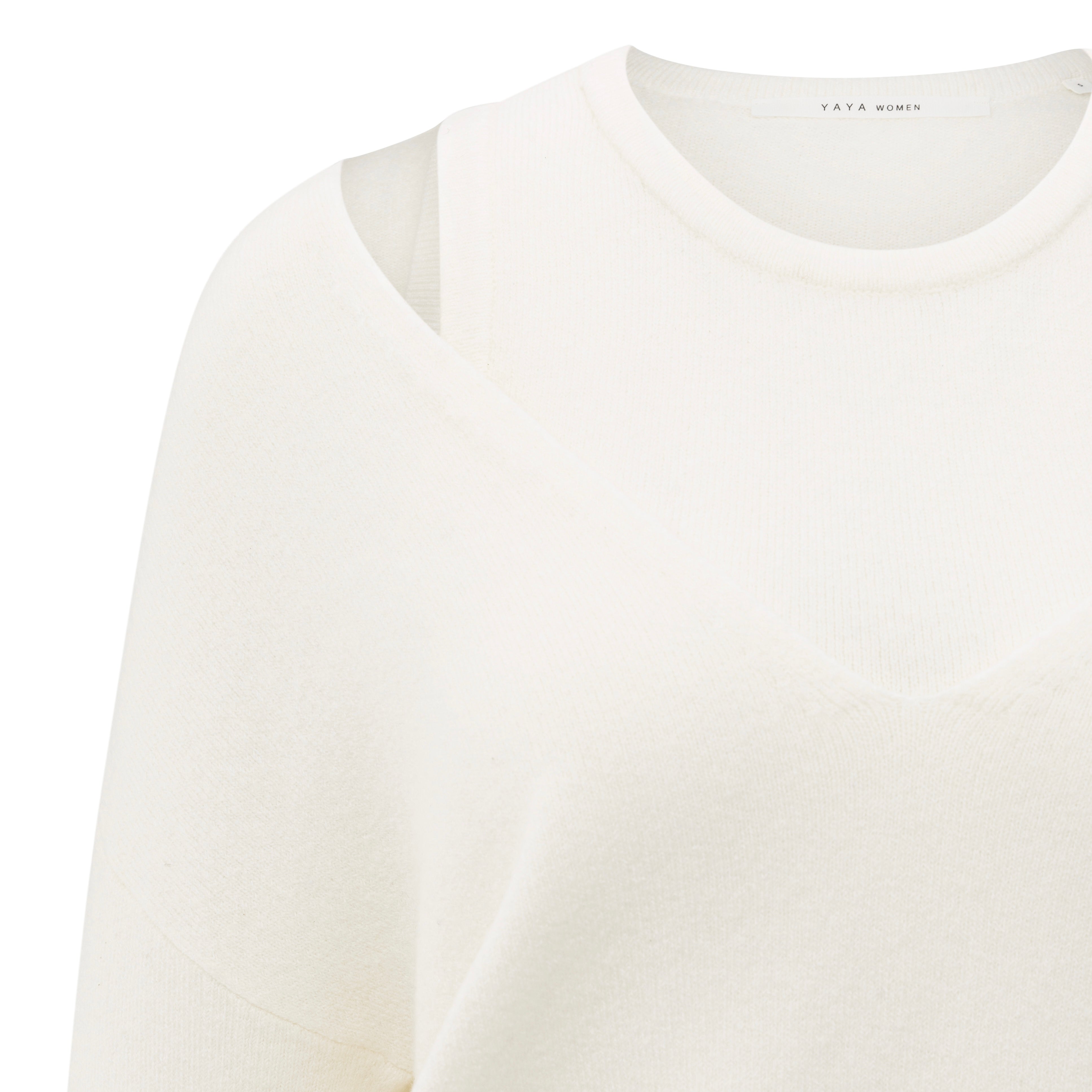 YAYA Off White Knit Melange Deep V-Neck Sweater With Layered Top